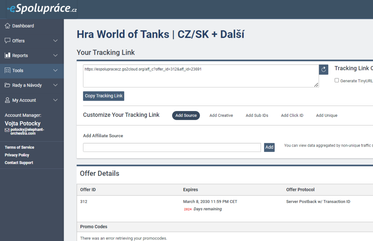 - Oblast pro vygenerování unikátního odkazu, díky kterému získáte provizi z propagace. (Tento odkaz je možno různě upravovat, zkracovat, přidat SUB_ID pro označení odkazu a více.)
